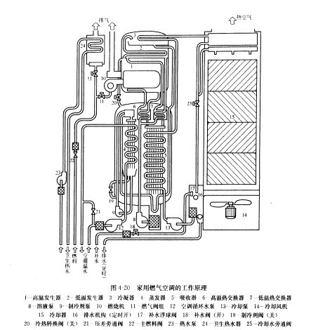 家用燃氣空凋的室外機用溴化鋰作吸收劑,用水作制冷劑,用天然氣等燃料作熱源。4℃的制冷劑水噴灑在蒸發器管束上,使管內14℃的空調水降溫到7℃;制冷劑水受熱后蒸發,溴化鋰溶液將蒸發的水蒸氣熱鳋吸收,然后通過冷卻器將其釋放到大氣中去;稀釋的溴化鋰溶液經過加熱濃縮,分離出水并再蒸發,濃溶液再次吸收熱量。如此循環往復,完成制冷。