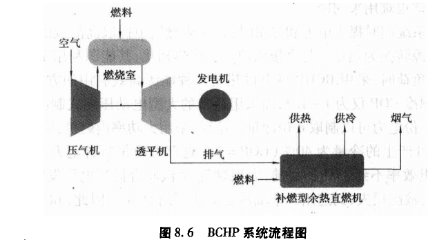 建筑熱電冷三聯供系統(BCHP系統),也稱為分布式供電系統的一種,是在建筑物內安裝燃氣或燃油發電機組發電,滿足建筑物的用電基礎負荷;同時,用其余熱產生熱水,用于采暖和生活熱水需要;在夏季還用發電的余熱產生冷量,用于空調的降溫和除濕。這樣,通過燃氣或燃油同時解決建筑物內供電、供熱和供冷的需要,所以稱為建筑熱電冷三聯供系統。燃氣輪機+余熱直燃機(補燃型)BCHP系統流程,如圖8.6所示。