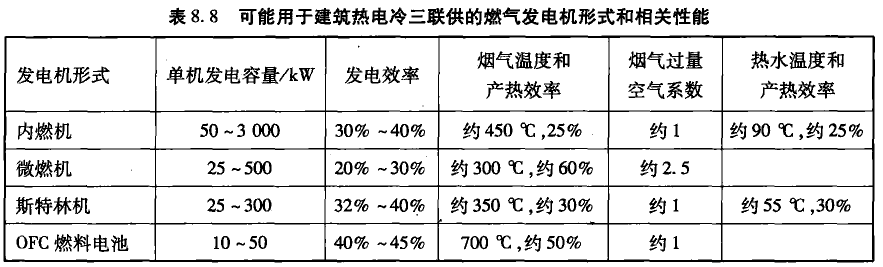 采用燃氣或燃油發電,有幾種不同形式,其發電效率、產熱效率和所產生熱量的承載形式也不同,從而決定能耗性能的差異,見表8.8。