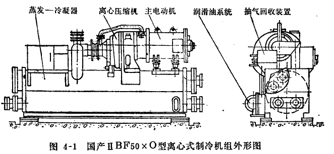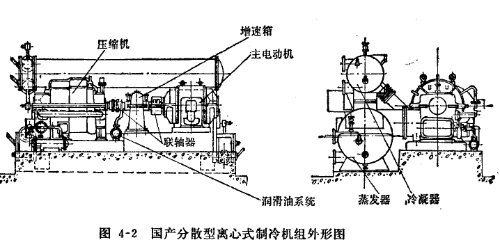 增速裝置外裝式,是指機組中的增速箱與壓縮機、主電動機各自分開,其間采用聯軸器連接。這種型式見于早期的分散型空調用離心式制冷機組中,如圖4-2所示外形圖。