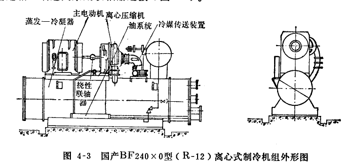 主電動機外裝式,是指機組中的離心式制冷壓縮機與增速箱裝在周一機殼內,主電動機與增速箱一端之聞采用聯軸器連接(圖4-3)。