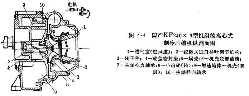 單級壓縮式是將單級離心式制冷壓縮機、增速裝置、主電動機裝在所聯接的封閉殼體之內(圖4-4)。