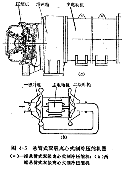 雙級壓縮式包括一端懸臂式(圖4-5a)、兩端懸臂式(圖4-5b)和兩端支掉式(圖4-6)。前者采用較多,增速箱根據需要有或無。