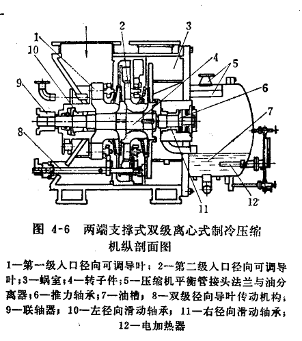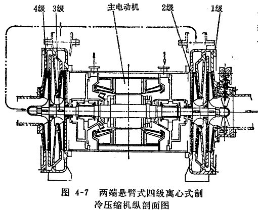 兩端懸臂式無增速裝置,兩級葉輪分別掛在主電動機軸兩端,兩級間有管路相通。由于壓縮機與主電動機轉速同步,轉速較低。圖4-7為兩蠟懸臂式四級離心式制冷壓縮機縱剖面圖。