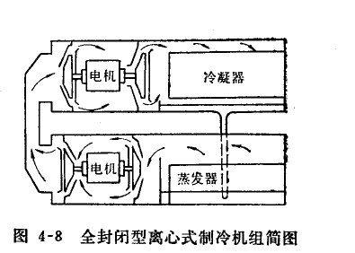 指整個制冷機組封閉在同一殼體內。一般用于小型空調用離心式制冷機組,優點是氣密性好,取消增速裝置因而結構簡單,噪聲低,振動小,外觀單一(見圖4-8)。