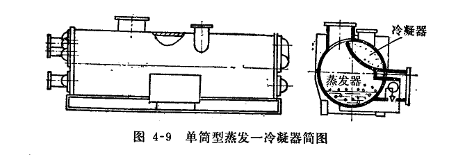 將蒸發器和冷凝器布置在同一筒體內,稱為單筒型蒸發一冷凝器。冷凝器位于上方,蒸發器位于下半部,其間有圓弧隔板分開。浮球閥室(節流裝置)位于筒體縱向中部下方。
