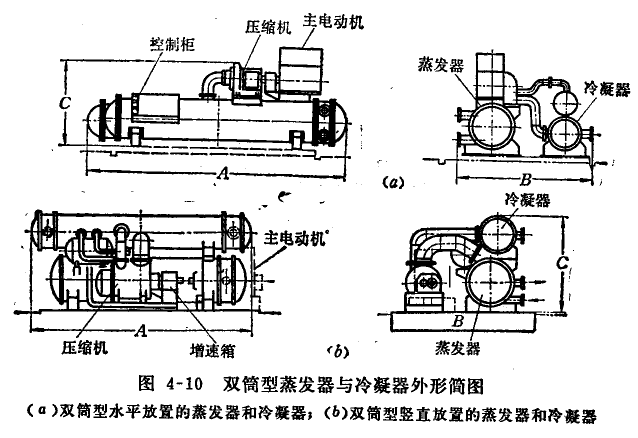 當機組制冷量太小時,出于工藝制造上的困難,常做成雙筒型。蒸發器和冷凝器各一個筒體,采取上下或橫排安裝方式。目前空調用機組上,國外仍有廠家采用。但在相互有絕熱要求的低溫離心式制冷機組中廣泛使用。