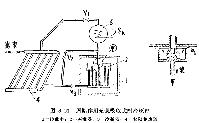圖8-21是利用太陽能的周期作用無泵吸收式制冷原理圖。太陽集熱器4內裝有一定濃度的制冷劑-吸收劑溶液。白晝有日照時,太陽集熱器用作為發生器,開啟閥門Vl,關閉閥門V2、V3,進行溶液的沸騰過程(即發生過程)。溶液在太陽集熱器內受熱,升溫至沸點后在定壓下沸騰,氣態制冷劑從其中蒸發出來,進入冷凝器3冷凝成液態,貯入蒸發器2內,而太陽集熱器中的溶液則逐漸變濃(以含吸收劑數量而言)。夜間,太陽集熱器用作吸收器,開啟閥門V2,關閉閥門V1、V3,進行制冷過程(即吸收過程)。集熱器對天空進行輻射,溶液溫度逐漸下降,因而整個系統中的壓力逐漸下降,蒸發器內制冷劑的飽和溫度也相應降低。當該溫度降至低于冷藏室1的溫度時,蒸發器內的液態制冷劑開始吸取冷藏室的熱量變成氣態,從而達到制冷的目的。蒸發器內形成的氣態制冷劑通過閥門V2進入吸收器,被其中的濃溶液吸收,溶液逐漸變稀,以再次進行沸騰過程和制冷過程。
