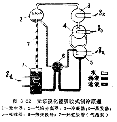 圖8-22為無泵溴化鋰吸收式制冷機的原理圖。由于吸收器5的壓力低于發生器1的壓力,故兩者應有一定的高度差,才能保證稀溶液自流進入發生器。稀溶液在發生器內受熱沸騰,靠熱虹吸管7將水蒸汽和濃溶液的混合物一起提升至氣液分離器2。經分離器分液后的高壓過熱水蒸汽進入冷凝器3,蒸發器4進行制冷,而分離出來的濃溶液積存在分離器的下部,靠高度差流經熱交換器6,再進入吸收器,吸收來自蒸發器的低壓冷劑水蒸汽。這種無泵溴化鋰吸收式制冷機靠熱虹吸管輸送溶液,簡化了制冷裝置。但是,它的熱力系數受熱媒溫度影響較大,熱媒溫度過高或過低均使其熱力系數急劇降低。此外,它的制冷能力較小,目前國外最大者,制冷量約25000kcal/h。
