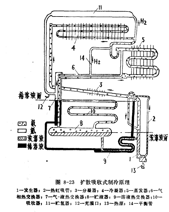 擴散式氨-水吸收式制冷機的工作原理如圖8-23所示。該系統是由氨循環、氨-水溶液循環