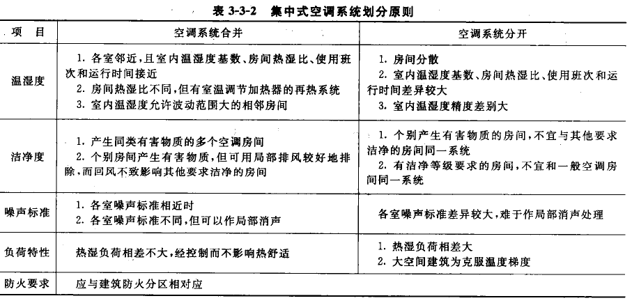 根據(jù)集中空調(diào)系統(tǒng)所服務(wù)建筑物的使用要求和特點,可按表3-3-2所列原則進行劃分。