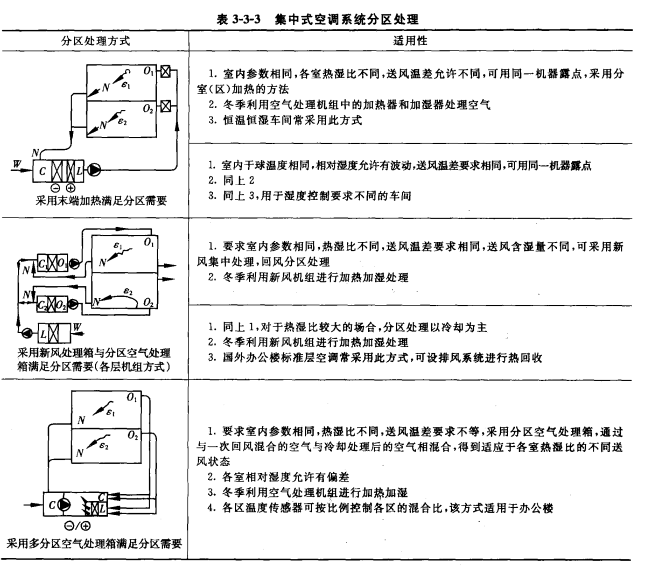 雖然在系統(tǒng)劃分時,盡可能把室內(nèi)參數(shù)、熱濕比等相近的房間組合成一個系統(tǒng),但仍不可避免有要求和條件不甚相同的房間需要組成共同的系統(tǒng),以減少投資和運行費用。分區(qū)處理的特征和適用性見表3-3-3。這時可以用集中處理新風(fēng)和相對集中分區(qū)處理送風(fēng)的方法來滿足實際需要。