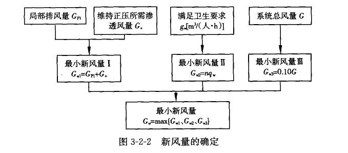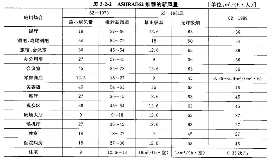 一般以稀釋室內產生的C02,使室內C02含量不超過01% (1L/m3)為基準,由此確定常態下每人新風量約為30m3/h。在實際工作中,可按《采暖通風與空氣調節設計規范》(GB 50019-2003)規定采用。對于人員密集和居留時間短暫的建筑物(如會堂、體育館等),新風量所形成的冷負荷比例很高,確定新風量時尤其應該慎重。表3-2-2給出美國ASHRAE62標準中每人所需室外新風量。