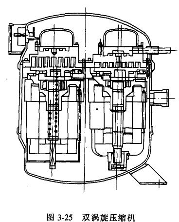 如圖3-25所示,雙渦旋壓縮機將兩個渦旋壓縮機封裝在同一鋼殼內,一個壓縮機為定轉速壓縮機,而另一個為變轉速壓縮機。此類壓縮 機可裝較多潤滑油和制冷劑,可保證壓縮機在多聯室內機組時有較可靠潤滑保證,并可實現無級調節,且功率范圍較大。