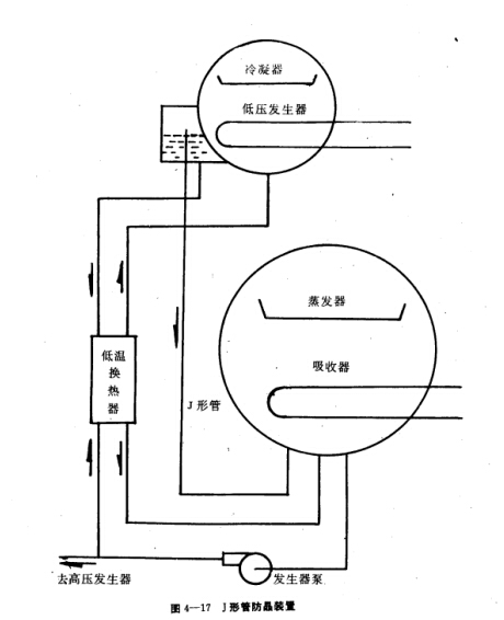 1.在低壓發生器和吸收器之間設置J形管防晶裝置,在溴化鋰吸收式制冷機中,溶液換熱器的濃溶液側最易結晶.設置J形管防晶裝置(圖4-17)后,當低溫換熱器結晶時,濃溶液不能回吸收器,低壓發生器的液位升高,便經J形管直接進入吸收器.而當發生器泵將溫度較高的溶液,經低溫換熱器送往低壓發生器時,就會使結晶自動清除.