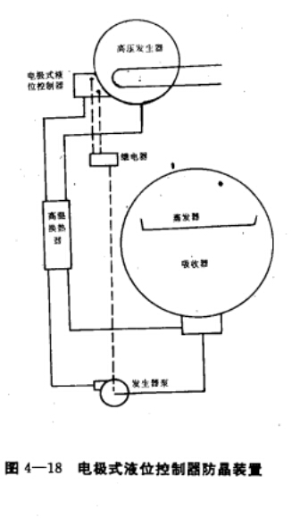 2.在高壓發生器的液囊中裝設電極式液位控制器.由于高壓發生器的壓力較高,它與吸收器之間不能采用J形管作為防晶裝置,可采用圖4-18所示的方法來消除結晶。當高溫換熱器結晶時,高壓發生器的液位升高,超出某一給定位置后,液位控制器動作.發生器泵停止運行,高壓發生器中的高溫溶液,由稀溶液管道經高溫換熱量倒汽回吸收器;高壓發生器液位降低后,由于液位控制器的作用.發生器泵重新運轉,把溫度較高的溶液,經高溫換熱器送入高壓發生器.如此反復對結晶部位進行加溫,就能使結晶消除.