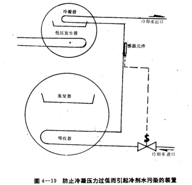 圖4-19是防止冷凝壓力過低而引起冷劑水污染的裝置,它是在吸收器冷卻水進口管道上裝設冷卻水量調節設備,通過改變冷卻水量來控制冷凝壓力,從而防止冷劑水污染.這種裝置雖然成本較高.但對于在冬季運行的機器,這種保護裝置還是必要的.