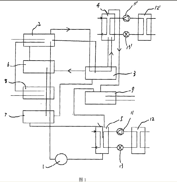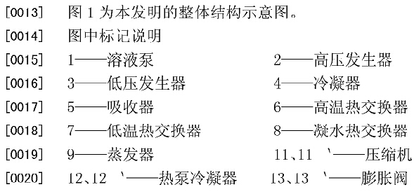 利用熱泵回收熱能的溴化鋰制冷機,包括高壓發生器、低壓發生器、蒸發器、吸收器、冷凝器、高溫熱交換器、低溫熱交換器、溶液泵、冷劑泵、控制系統及連接各部件的管路、閥,其特征在于:吸收器和冷凝器設計成熱泵蒸發器,并且將熱泵蒸發器的蒸發管代替吸收器和/或冷凝器中的冷卻管,并將吸收器和/或冷凝器中的冷卻管分別與壓縮機、熱泵冷凝器和膨脹閥串聯構成熱泵機組,從而能夠將溴化鋰制冷機中吸收器和冷凝器釋放出來的熱量通過熱泵機組轉換成較高品位的熱量后加以再利用。其優點是:生產效率高,提高制冷機運行穩定性和適應性。