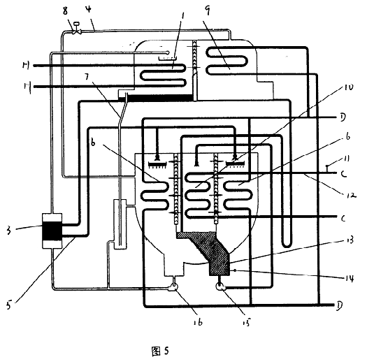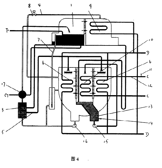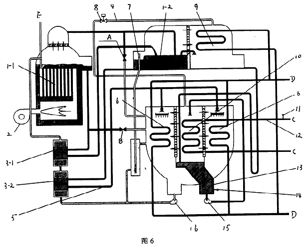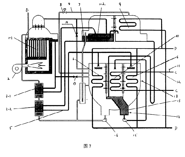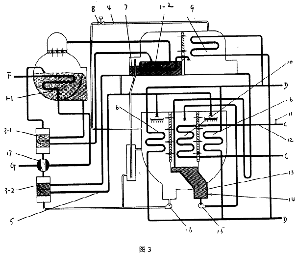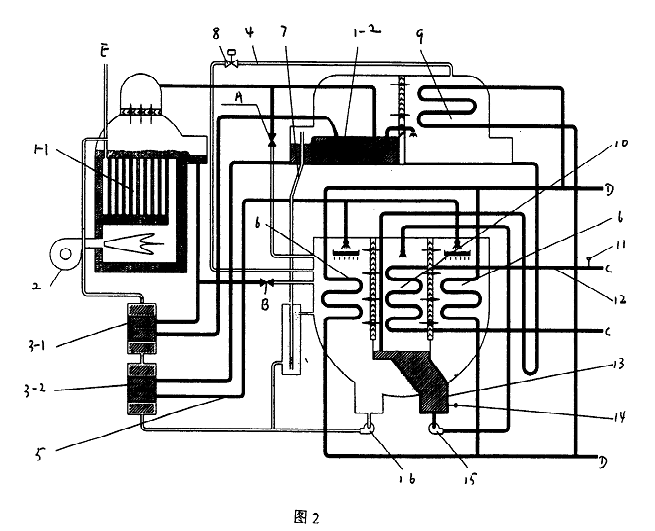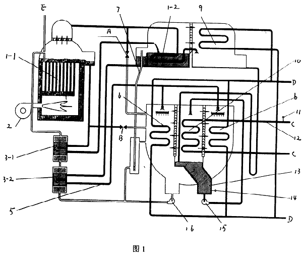 圖1中,直燃高壓發生器1-1、燃燒器2、高溫熱交換器3-1、低溫熱交換器3-2、吸收器進液管5、吸收器6、融晶管7、低壓發生器1-2、冷凝器9、蒸發器10、冷水出口溫度傳感器11、冷水出口管12、冷劑水液囊13、冷劑水溫度傳感器14、冷劑泵15和溶液泵16。