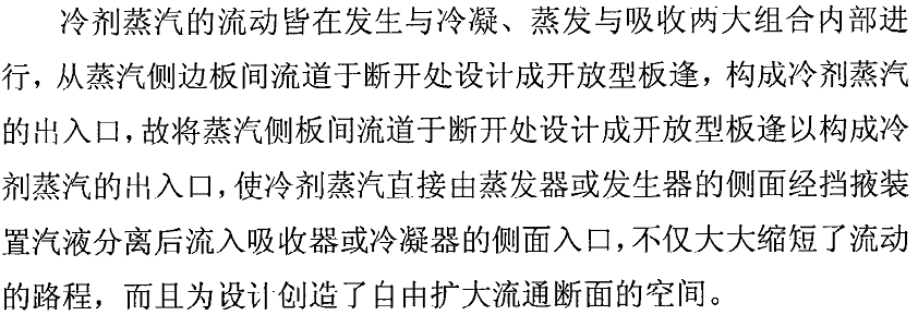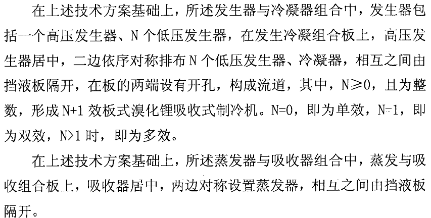 所述的發生器、冷凝器設置于同一板面上,構成發生冷凝組合板面,相互之間斷開一空間,用于設置擋液裝置,所述發生冷凝組合板面不少于二張,重疊設置后整體吲定,層間有間隙,形成流道,構成發生器與冷凝器組合;