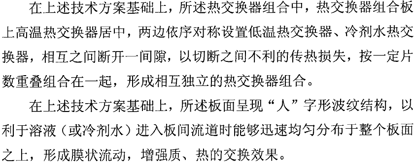 所述的熱交換器包括高溫熱交換器、低溫熱交換器及冷劑水熱交換器,各熱交換器設置丁同‘板面上,構成熱交換器組合板面,相互之間斷開一間隙,以切斷之間不利的傳熱損欠,所述發生冷凝組合板面不少于二張,重疊設置后整體固定,層間有問隙,形成流道,構成熱交換器組合;