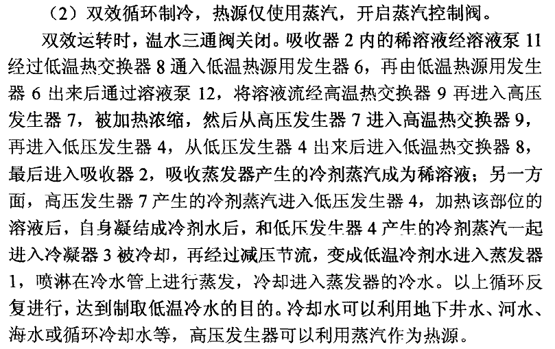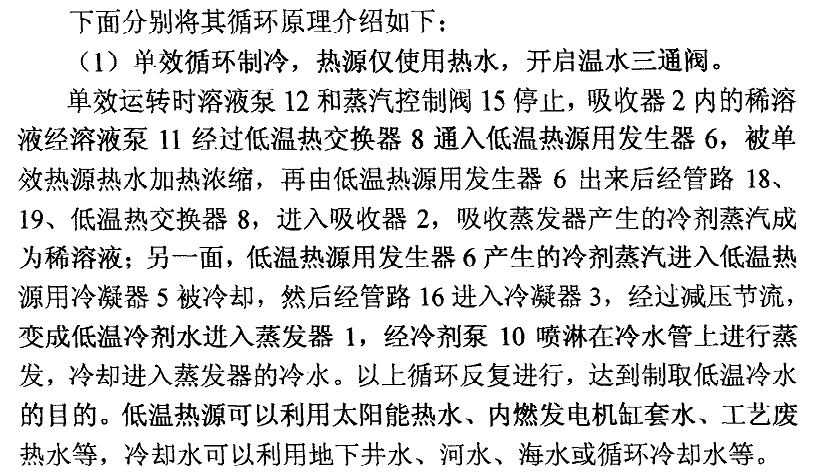 吸收器2內(nèi)的稀溶液經(jīng)溶液泵11經(jīng)過低溫?zé)峤粨Q器8通入低溫?zé)嵩从冒l(fā)生器6,被單效熱源熱水加熱濃縮,由低溫?zé)嵩从冒l(fā)生器6出來后經(jīng)溶液泵12、高溫?zé)峤粨Q器9進(jìn)入高壓發(fā)生器7,被加熱濃縮后進(jìn)入高溫?zé)峤粨Q器9,再進(jìn)入低壓發(fā)生器4,然后經(jīng)溶液泵1 3進(jìn)入低溫?zé)峤粨Q器8,最后進(jìn)入吸收器2,吸收蒸發(fā)器產(chǎn)生的冷劑蒸汽成為稀溶液:另一方面,高壓發(fā)生器7產(chǎn)生的冷劑蒸汽先進(jìn)入低壓發(fā)生器4,加熱該部位的溶液后,自身凝結(jié)成冷劑水后,和低壓發(fā)生器4產(chǎn)生的冷劑蒸汽一起進(jìn)入冷凝器3被冷卻,同時低溫?zé)嵩从冒l(fā)生器6產(chǎn)生的冷劑蒸汽進(jìn)入低溫?zé)嵩从美淠?被冷卻,然后經(jīng)管路16進(jìn)入冷凝器3,與在冷凝器3被冷卻的冷劑混合后,經(jīng)過減壓節(jié)流,變成低溫冷劑水進(jìn)入蒸發(fā)器l,噴淋在冷水管上進(jìn)行蒸發(fā),冷卻進(jìn)入蒸發(fā)器的冷水。以上循環(huán)反復(fù)進(jìn)行,達(dá)到制取低溫冷水的目的。低溫?zé)嵩纯梢岳锰柲軣崴?nèi)燃發(fā)電機(jī)缸套水、工藝廢熱水等,冷卻水呵以利用地下井水、河水、海水或循環(huán)冷卻水等,高壓發(fā)生器可以利用蒸汽作為熱源。