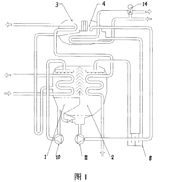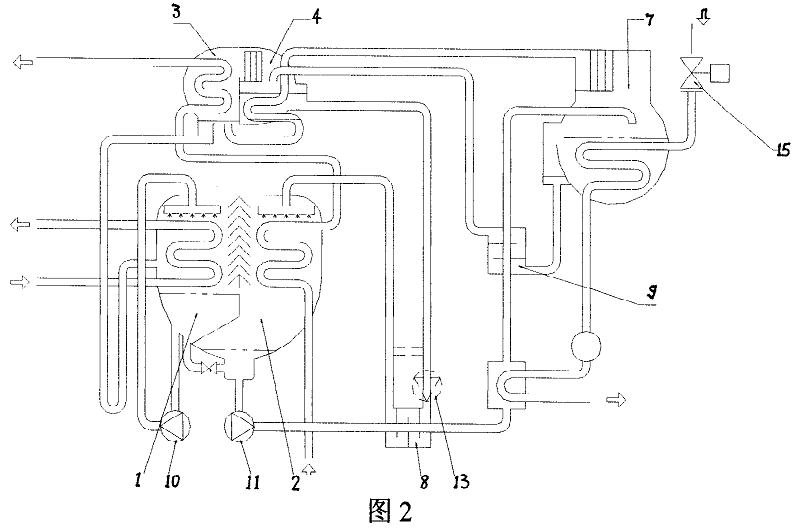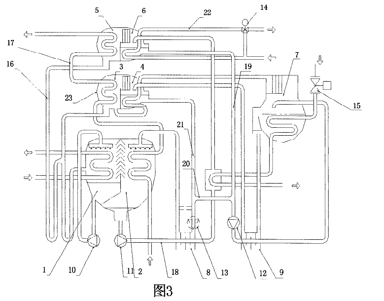 如圖3所示的低溫水/蒸汽單雙效溴化鋰吸收式制冷機(jī),機(jī)組包括下筒和上筒,下筒由蒸發(fā)器1和吸收器2構(gòu)成,上筒由冷凝器3和低壓發(fā)生器4構(gòu)成,蒸汽型高壓發(fā)生器與下筒經(jīng)溶液泵、低溫交換器由連接配管連通,蒸汽型高壓發(fā)生器與上筒經(jīng)高溫?zé)峤粨Q器由連接配管連通,在機(jī)組里增加一個上上筒,上上筒由低溫?zé)嵩从美淠?和低溫?zé)嵩从冒l(fā)生器6組成,低溫?zé)嵩从美淠?通過冷劑管16連通冷凝器3,低溫?zé)嵩从美淠骼鋮s水管17與冷凝器冷卻水管相連通,吸收器2經(jīng)溶液泵11的稀溶液管18連通低溫?zé)嵩从冒l(fā)生器6,低溫?zé)嵩从冒l(fā)生器出來的中間溶液管19一路連溶液泵12,一路經(jīng)連通管20連低壓發(fā)生器4出來的濃溶液管21,低溫?zé)嵩从冒l(fā)生器中通介質(zhì)為熱水的熱源管22,熱源管上有閥門14,上上筒布置在上筒23上方。高壓發(fā)生器7結(jié)構(gòu)為蒸汽型發(fā)生器,安裝蒸汽控制閥。根據(jù)負(fù)荷及熱源情況,通過控制溫水三通閥14和溶液泵12、蒸汽控制閥15,可分別實現(xiàn)單效循環(huán)制冷、雙效循環(huán)制冷、單雙效同時運(yùn)轉(zhuǎn)制冷。