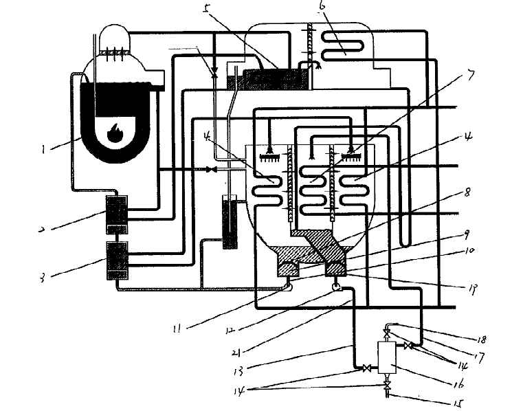 溴化鋰吸收式制冷機由于其溴化鋰溶液在有氧情況下對金屬材料有較強的腐蝕性,因此對真空度要求極高,各部件之間的連接均采用焊接連接。與大多數機械設備一樣,溴化鋰吸收式制冷機(簡稱機組)在運行時,由于機組內部腐蝕、溶液使用時間過長變質等原因,其循環工作介質(溴化理溶液和冷劑水)中會含有各種雜質。這些雜質必須從循環工作介質中過濾和去除掉,否則會影響機組的正常運行,縮短機組的使用壽命。目前溴化鋰吸收式制冷機上常用的過濾器如圖l所示,通過在機組吸收器4底部的溶液液囊9及冷劑水液囊19中設置過濾網8,將溶液和冷劑水中的雜質阻擋在溶液泵11和冷劑泵12之前,以免雜質與循環工作介質一起進入機組各部件。由于溴化鋰吸收式制冷機通常都是焊接式結構,過濾網既不能清洗,也不能更換,所以過濾網的網孔直徑一般較大,只能過濾直徑較大的雜質,對于直徑微小的雜質則無能為力。這些直徑微小的雜質通常是機組在真空較差時溴化鋰溶液與金屬材料發生化學發應而生成,一旦產生就