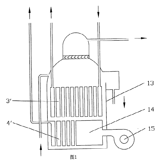 圖中:余熱煙氣換熱管束Ⅰ1、出煙道Ⅰ2、余熱煙氣換熱管束Ⅱ3、出煙道Ⅱ4、余熱煙氣出口連接管Ⅱ5、余熱煙氣出口連接管Ⅰ6、余熱煙氣進口連接管Ⅱ7、余熱煙氣進口連接管Ⅰ8、補燃排煙連接管9、進煙道Ⅱ10、進煙道Ⅱ1、補燃煙氣換熱管束12、筒體13、爐筒14、燃燒器15、補燃發生器l6、高溫熱交換器17、低溫熱交換器18、溶液切換閥19、吸收器20、蒸汽切換閥2l、低壓發生器22、冷凝器23、蒸發器24、溶液泵25、冷劑泵26、煙氣熱水換熱器27、熱水進口管28、溶液調節閥29、熱水出口管30、復合型低壓發生器31、余熱煙氣換熱管束3’、補燃煙氣換熱管束4’。