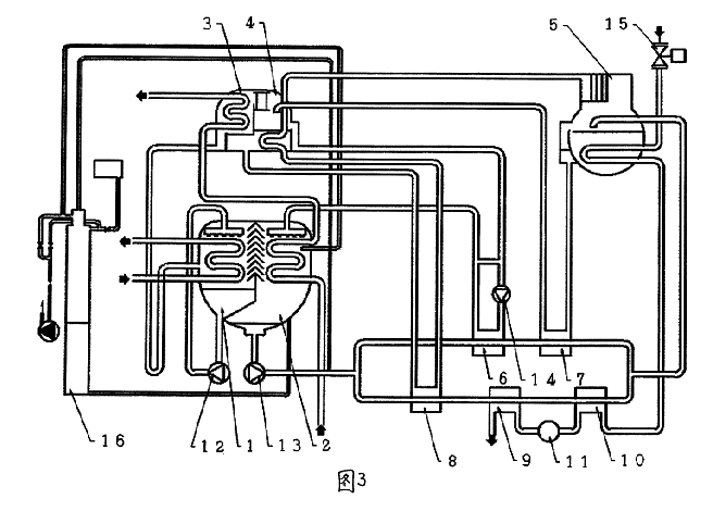 圖3為本發明的高效率蒸汽雙效溴化鋰吸收式制冷機組第一種方式循環流程圖。