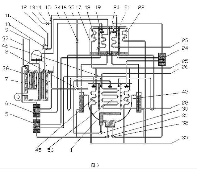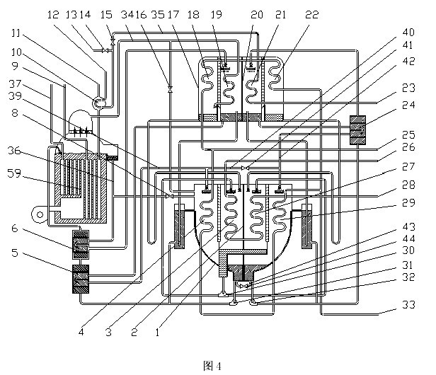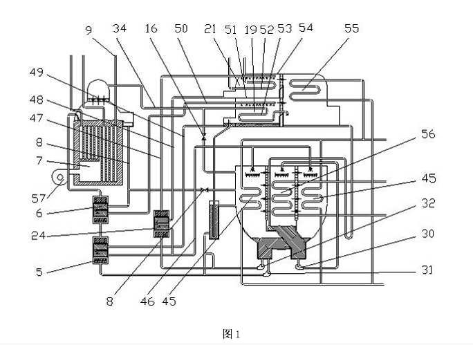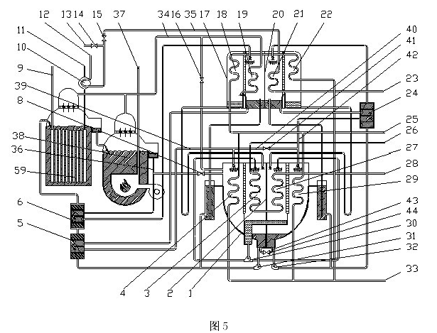 蒸發吸收器筒體1、蒸發吸收器分段隔板2、雙效蒸發器3、雙效吸收器4、低溫熱交換器5、高溫熱交換器6、煙氣補燃型高壓發生器7、溶液切換閥8、余熱煙氣進口管9、煙氣換熱器10、余熱煙氣出口管11、熱水進口管12、第一熱水出口管13、第一熱水切換閥14、第二熱水切換閥15、蒸汽切換閥16、低發冷凝器簡體17、雙效冷凝器18、蒸汽發生器19、低發冷凝器分段隔板20、熱水發生器21、單效冷凝器22、第二熱水出口管23、單效熱交換器24、冷卻水出口管25、冷(熱)水出口管26、單效蒸發器27、冷(熱)水進口管28、單效吸收器29、冷劑泵30、雙效溶液泵31、單效溶液泵32、冷卻水進口管33、冷劑蒸汽管34、熱水聯通管道35、高發出液管36、補燃煙氣出口管37、直燃高壓發生器38、雙效吸收器進液管39、濃溶液連通管40、濃溶液截止閥41、單效吸收器進液管42、稀溶液連通管43、稀溶液截止閥44、吸收器45、吸收器進液管46、熱水發生器進液管47、熱水發生器出液管48、蒸汽發生器出液管49、蒸汽發生器進液管50、分隔板51、熱水換熱管束52、蒸汽換熱管束53、筒體54、冷凝器55、蒸發器56、燃燒器57、煙汽型高壓發生器59。