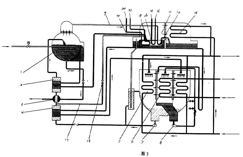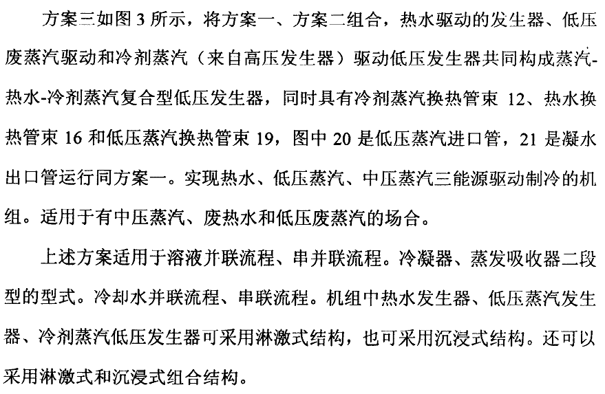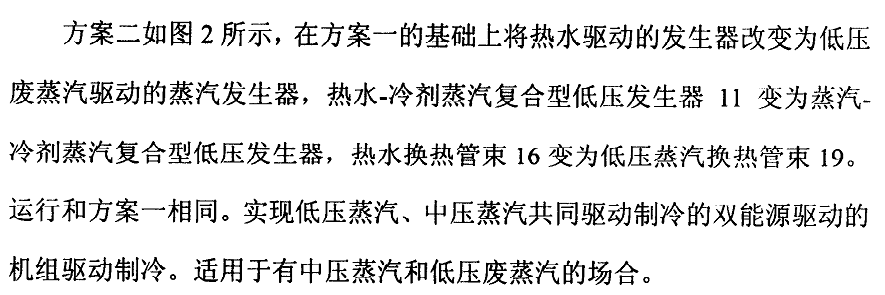 收器進液管進入吸收器,機組的溶液流程為串聯流程。熱水—冷劑蒸汽復合型低壓發生器11冷劑蒸汽換熱管束12內的冷劑蒸汽加熱管外溶液放熱后凝結成冷劑水,經冷劑水出口進入冷凝器13;熱水—冷劑蒸汽復合型低壓發生器11的熱水和冷刺蒸汽換熱管束的管外溶液被加熱產生的蒸汽進入冷凝器13,被冷凝成冷劑水。冷凝器凝結的冷劑水進入蒸發器6,被噴啉到蒸發器管外進行蒸發制冷,從而實現同時利用廢熱熱水和中壓蒸汽來驅動機組進行供冷運行。實現最大限度利用外部廢熱水制冷,在熱量不足時采用中壓蒸汽來補充,實現熱水、中壓蒸汽共同驅動制冷的雙能源驅動的功能,達到節能運行的目的。適用于有中壓蒸汽、廢熱水的場合。