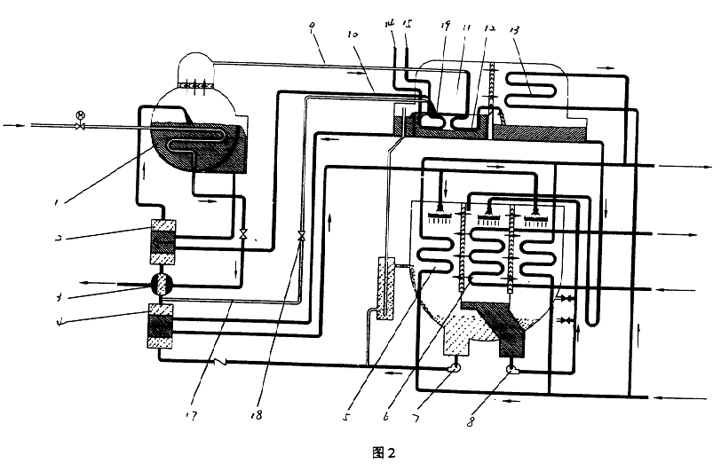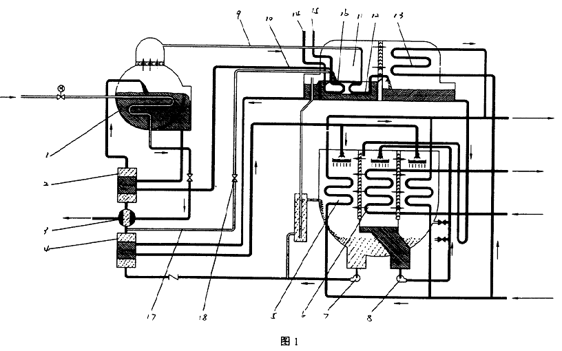 方案一如圖1所示機組,該機組是由高壓發生器1、高溫熱交換器2、凝水熱交換器3、低溫熱交換器4、吸收器5、蒸發器6、溶液泵7、冷劑泵8、高發冷劑蒸汽進低發管9、中問溶液進低發管10、熱水一冷劑蒸汽復合型低壓發生器11、冷劑蒸汽換熱管束12、冷凝器13、熱水進口管14、熱水出口管15、熱水換熱管束16、稀溶液進熱水一冷劑蒸汽復合型低壓發生器管17、調節閥18、控制系統(圖中未示出)及連接各部件的管路、閥所構成的熱水一蒸汽雙效型溴化鋰吸收式制冷機。熱水發生器換熱管束16和冷劑蒸汽換熱管束12放置在同一個腔體,構成熱水一冷劑蒸汽復合型低壓發生器11。在低溫熱交換器4出口稀溶液管路上設有稀溶液進熱水,冷劑蒸汽復合型低壓發生器管17,管路17上加調節閥18。機組制冷運行時,由溶液泵7從吸收器5中輸出的稀溶液經低溫熱交換器4后,一部分串聯經凝水熱交換器3和高溫熱交換器2換熱升溫后進入高壓發生器1;一部分經稀溶液管17和調節閥18進入熱水一冷劑蒸汽復合型低壓發生器11。進入高壓發生器1中的稀溶液被來自外部裝置的中壓蒸汽加熱濃縮成中間溶液,經高發出液管進入高溫熱交換器換熱降溫后,進入熱水一冷劑蒸汽復合型低壓發生器11,和進入熱水一冷劑蒸汽復合型低壓發生器11和稀溶液混合或分開分別均勻分布在熱水換熱管束16和冷劑蒸汽換熱管束12上。一路被來自外部裝置的熱水(包括余熱熱水和其它形式的熱水)加熱濃縮成濃溶液;一路經中間溶液布液管均勻分布在冷劑蒸汽換熱管束上,被管內冷劑蒸汽(來自高壓發生器)進一步加熱濃縮成濃溶液。從熱水—冷劑蒸汽復合型低壓發生器11中流出的濃溶液經低發出液管進入低溫熟交換器4換熱降溫后,經吸