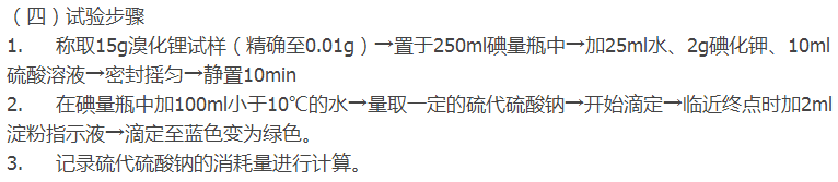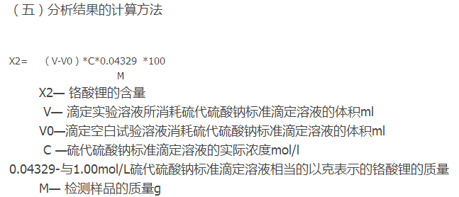 在酸性條件下,鉻酸鋰轉換為重鉻酸根,將KI氧化為I2,用淀粉作指示液,用硫代硫酸鈉標準滴定液滴定。