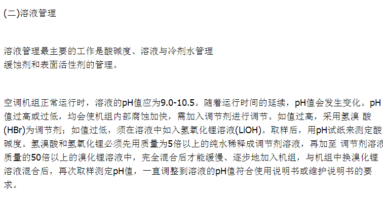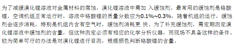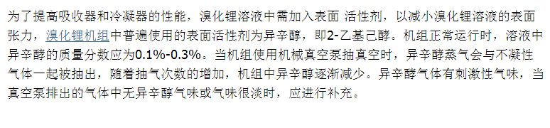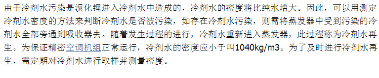 溴化鋰吸收式制冷機組(冷熱水機組)所用的制冷劑是水,通常稱為冷劑水,在機組運行時,或多或少會有少量溴化鋰進入蒸發器的冷劑水中,由于溴化鋰不會蒸發,而冷劑水在不斷發,溴化鋰將在蒸發器中積累下來,這種現象稱為冷劑水污染。發生冷劑水污染時,機組性能下降、制冷量不足。