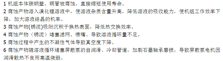 溴化鋰機組在使用過程中由于緩蝕劑不斷的消耗其含量逐漸不足,再加上機組氣密性不佳時氧氣的侵入,造成溴化鋰溶液的腐蝕性增強,加上銅(Cu2+)鐵(Fe3+)離子的相互(電位差)腐蝕,機組經常出現一下問題: