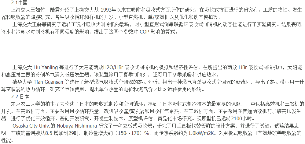 摘要:溴化鋰吸收式制冷技術(shù)在我國得到了飛速發(fā)展和廣泛應(yīng)用。通過對溴化鋰吸收式制冷技術(shù)的回顧與展望,在此基礎(chǔ)上簡單介紹了世界各國對吸收式制冷的研發(fā)和應(yīng)用現(xiàn)狀。因化工、電力行業(yè)普遍有余熱資源可以利用,溴化鋰制冷正好適應(yīng)此特點,回收大量余熱、節(jié)約生產(chǎn)成本創(chuàng)造剩余價值。尤其我國將熱、電、冷聯(lián)產(chǎn)技術(shù)作為國家鼓勵發(fā)展的通用節(jié)能技術(shù),這更為溴化鋰制冷技術(shù)提供了廣闊的發(fā)展空間。