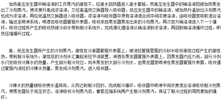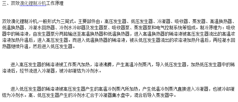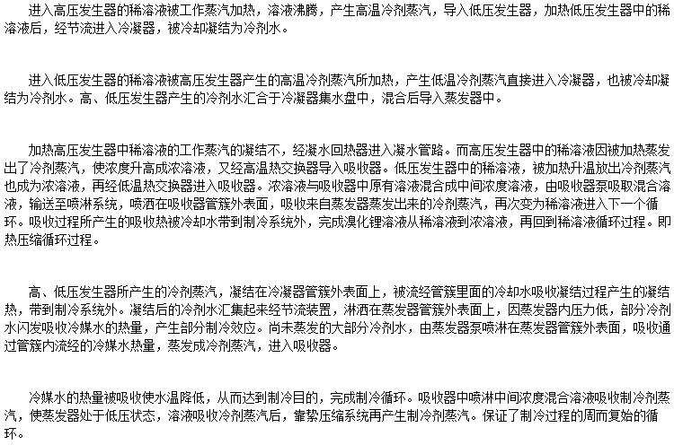 在溴化鋰吸收式制冷機中,水作為制冷劑用來產生冷效應,溴化鋰溶液作為吸收劑,用來吸收產生冷效應后的冷劑蒸汽。因此,水和溴化鋰溶液組成制冷機中的工質對。