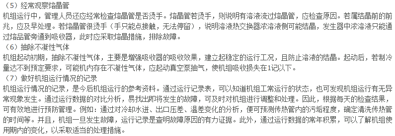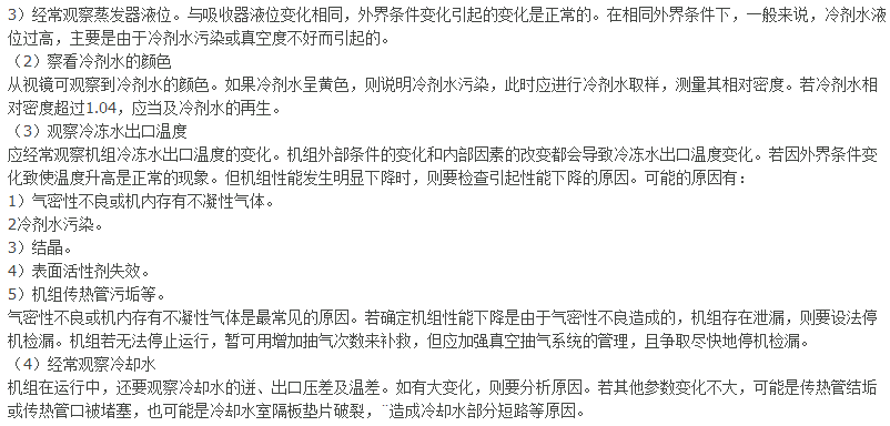 在機(jī)組運(yùn)行中應(yīng)對(duì)發(fā)生器、吸收器及蒸發(fā)器的液位勤加觀察,即使是全自動(dòng)控制的機(jī)組,也應(yīng)如此。