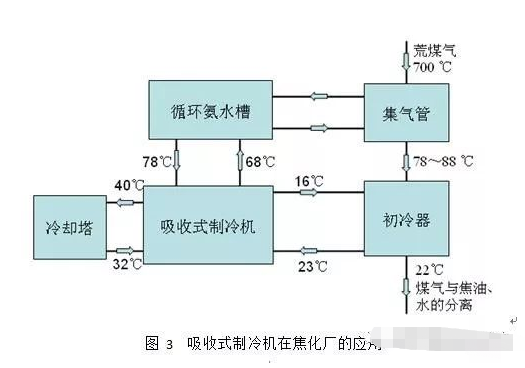 a、化肥廠,利用尿素系統(tǒng)一吸冷卻器產(chǎn)生的熱水驅(qū)動(dòng)吸收式制冷機(jī)制冷,給壓縮機(jī)一段入口的半水煤氣降溫,如圖2